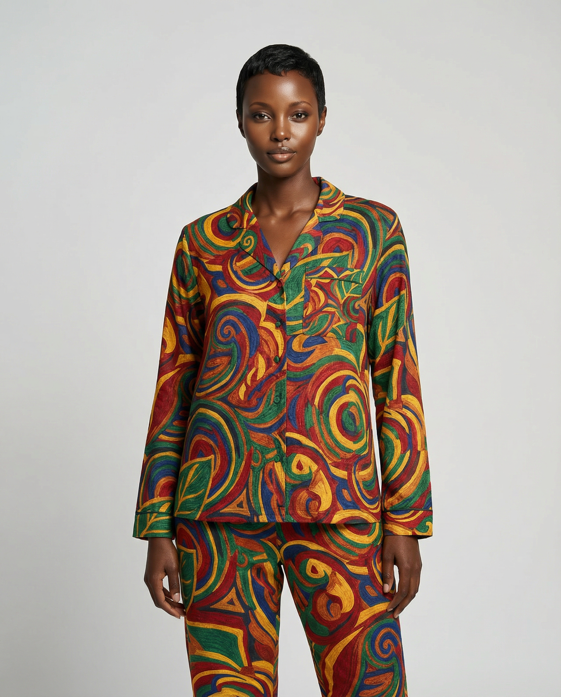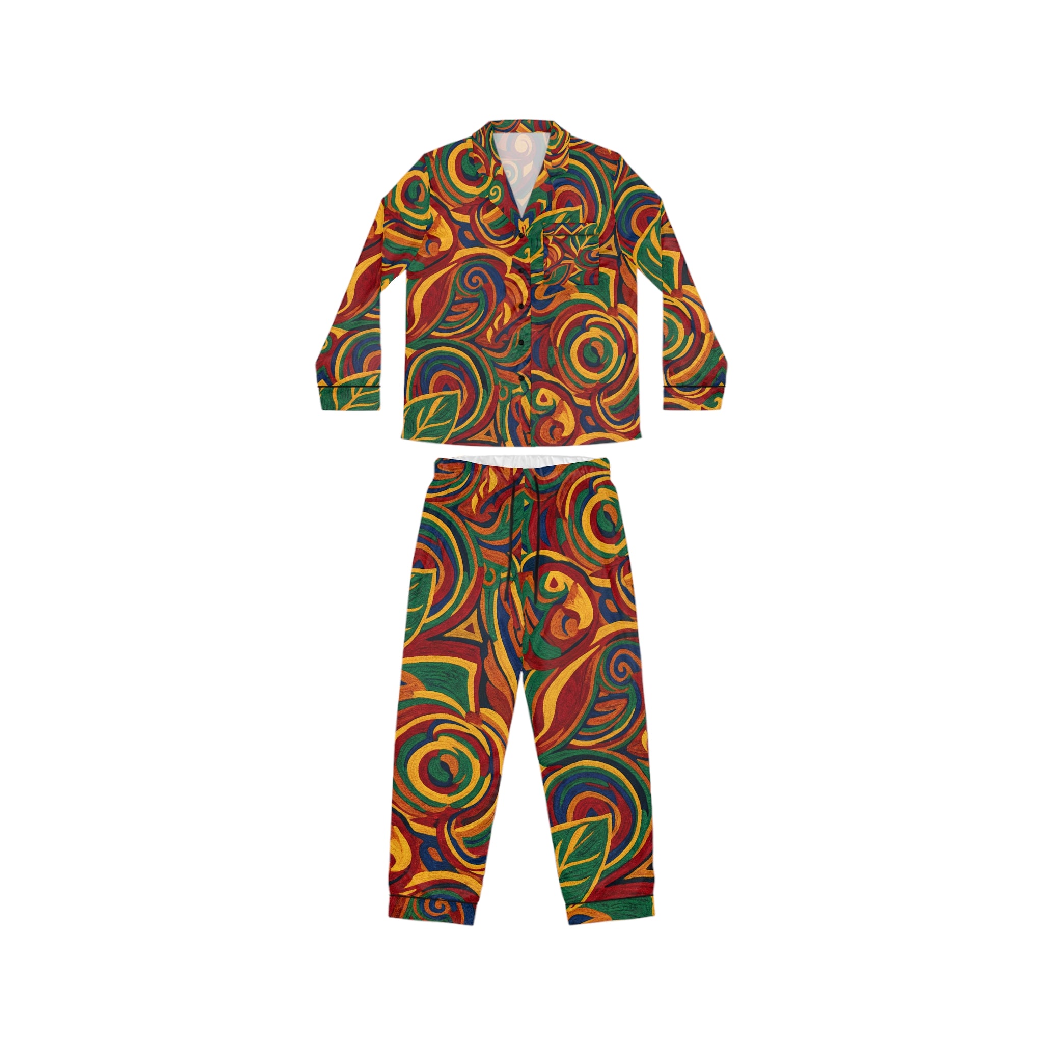 Slip into nightwear that feels like a warm, creative hug. These satin pajamas wrap you in a silken sheen with a vibrant, hand-painted pattern of swirling leaves and sunlit spirals — colors that wake the senses while the fabric soothes the skin. The notch lapel and button-front shirt bring a timeless, relaxed silhouette; the drawstring waist lets you dial comfort up or down. Lightweight stretch moves with you whether you’re winding down with tea, reading under a lamp, or stretching into a slow morning. This set belongs to someone who loves color, texture, and the quiet joy of slow evenings at home.