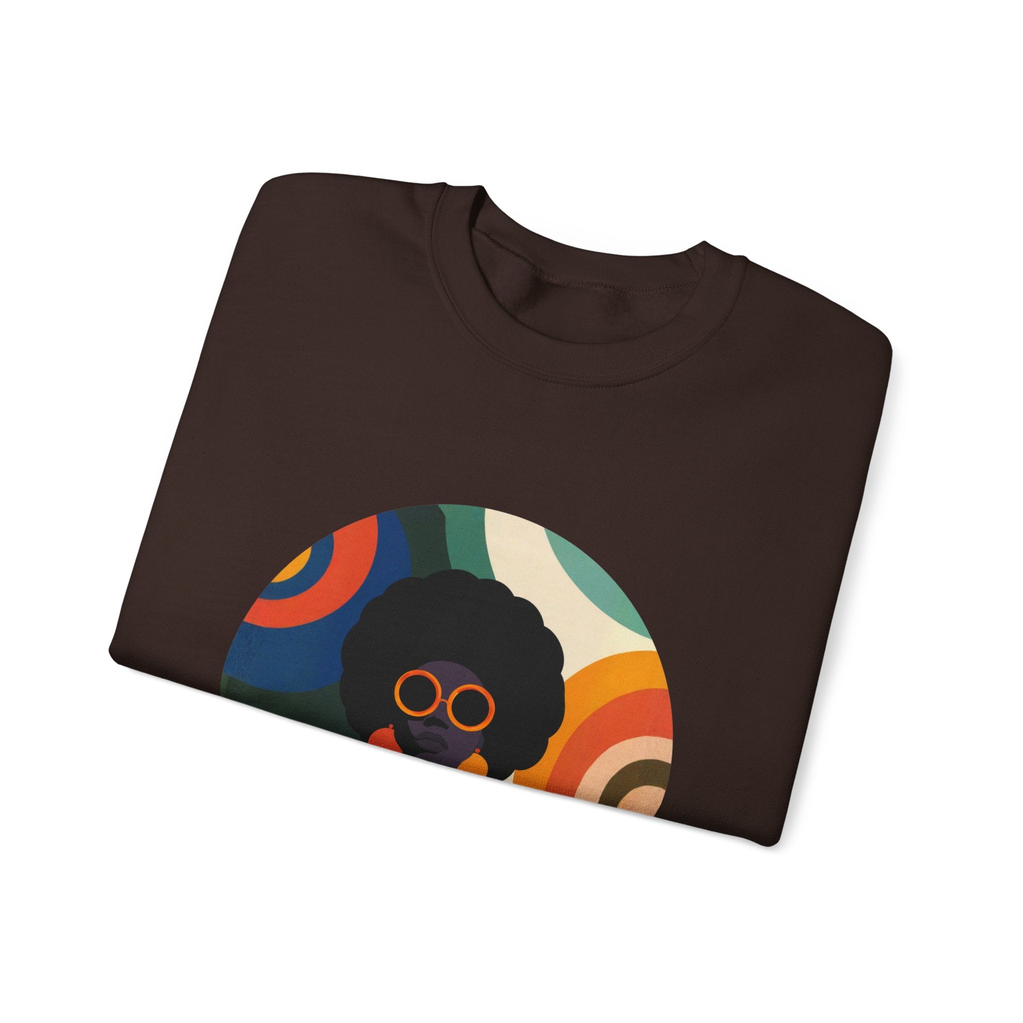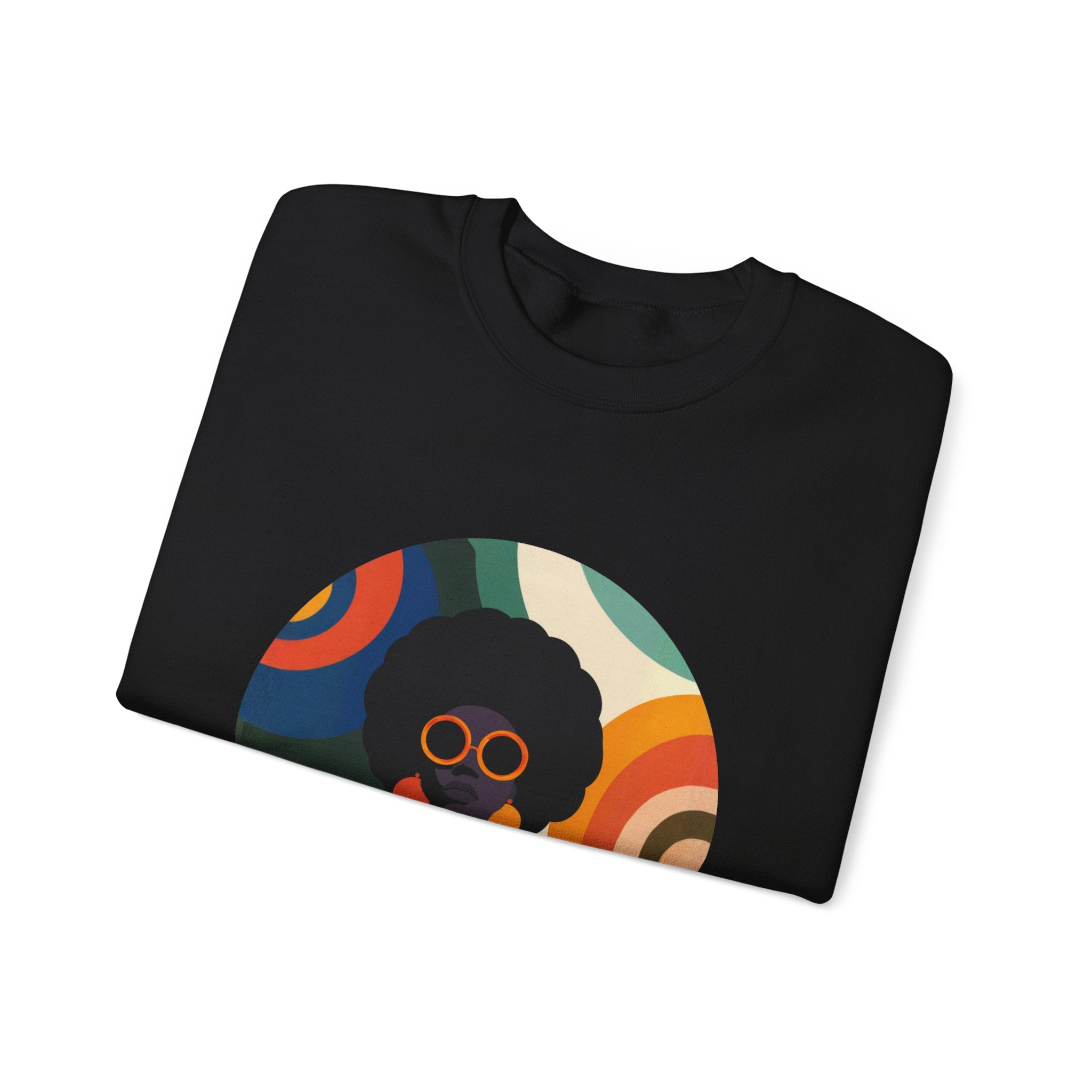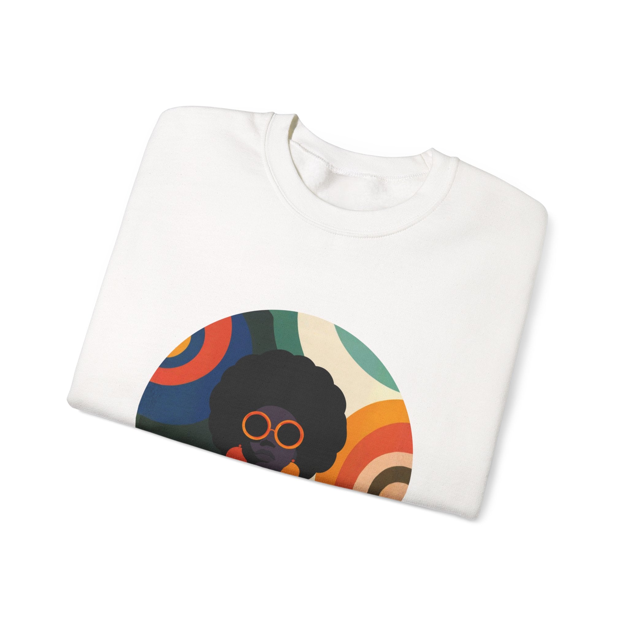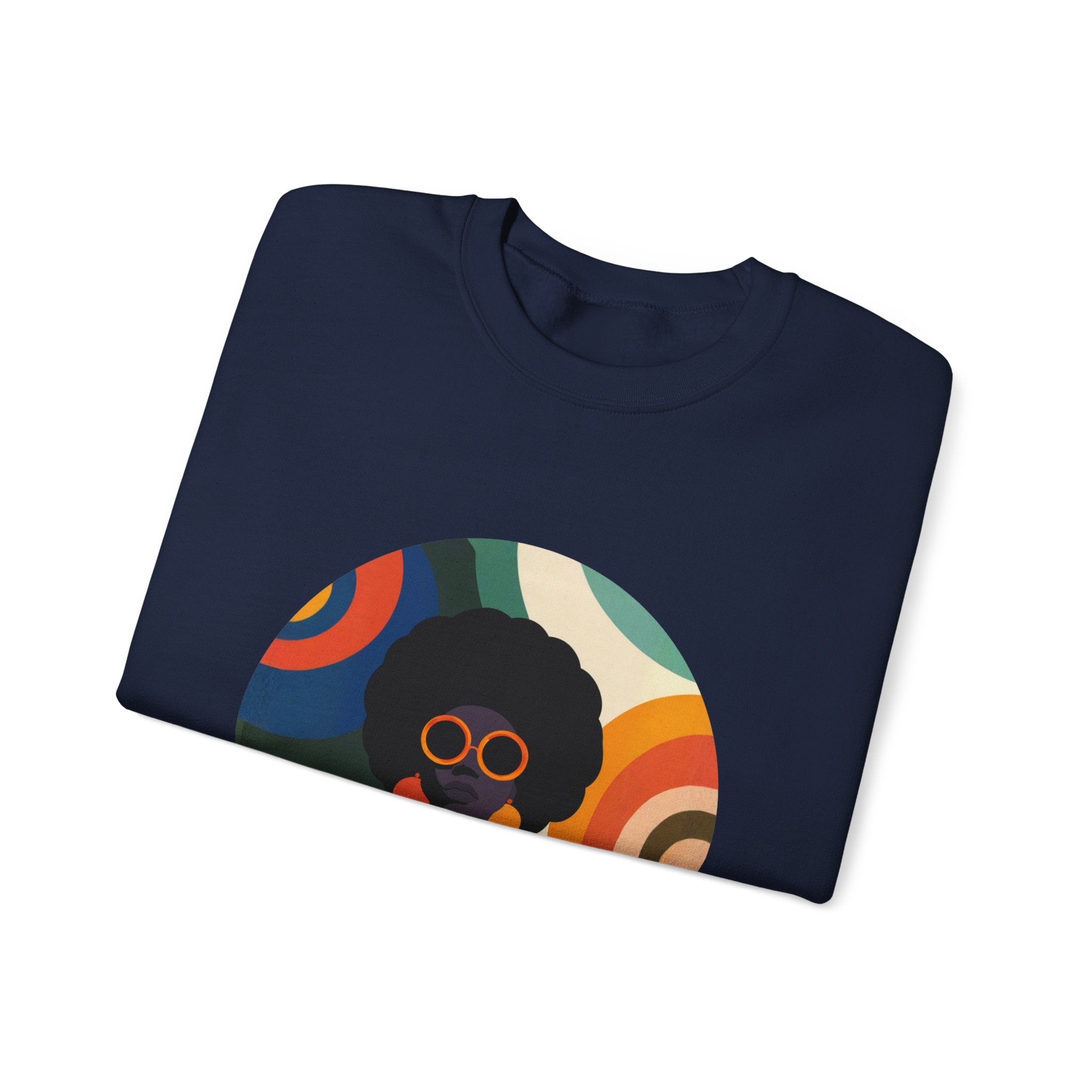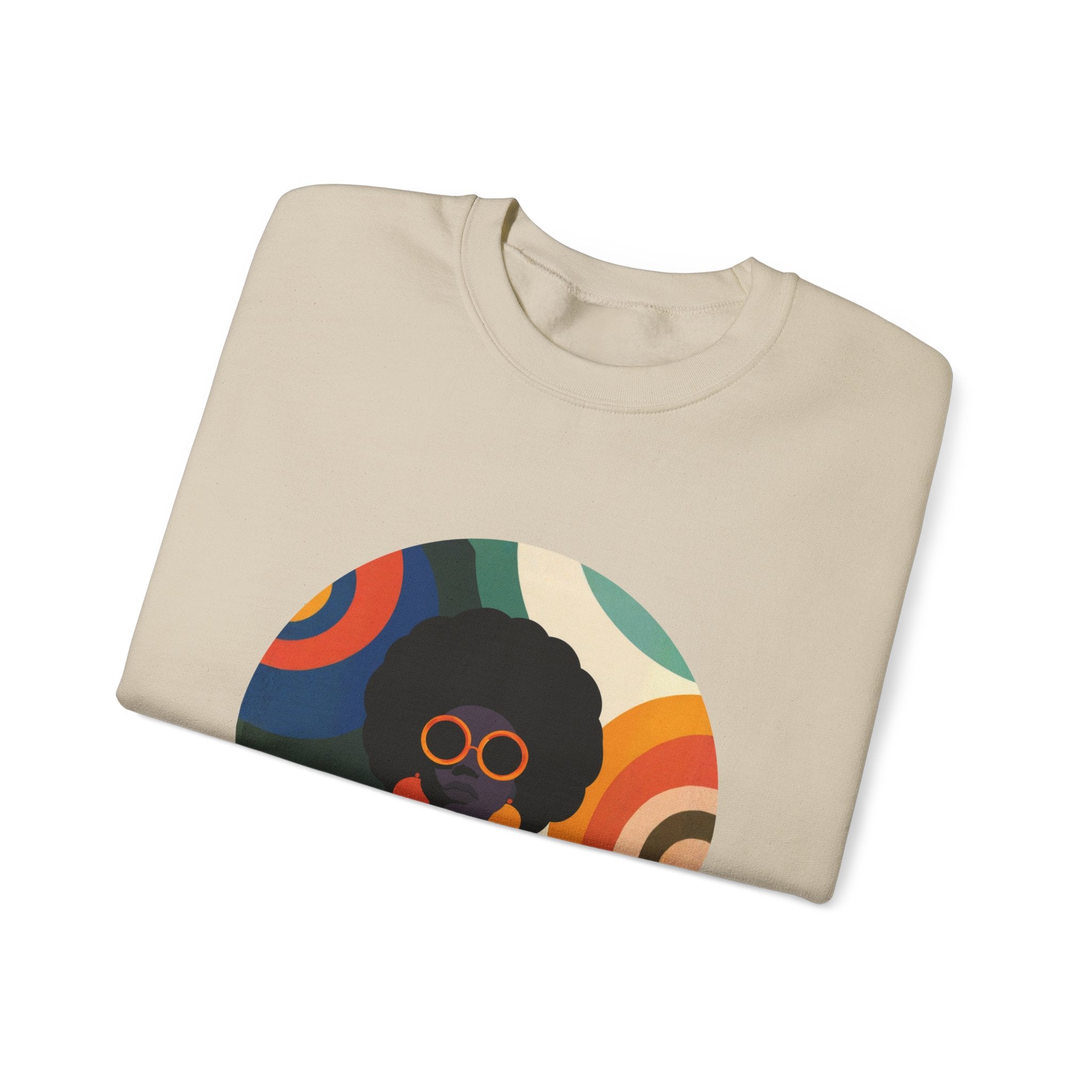 This cozy crewneck brings vintage soul and modern comfort together. A soft, medium-heavy cotton-poly blend holds a bold, retro circular graphic—warm oranges, teals and earthy neutrals swirl around a stylized silhouette with round glasses—so the design reads like a small, confident statement rather than loud branding. The classic fit and ribbed collar keep the shape neat while double-needle stitching ensures this sweatshirt stands up to frequent wear. Lightweight enough for layered fall walks, yet substantial for chilly evenings at home or low-key gallery nights. Ethically sourced cotton and OEKO-TEX certified dyes mean it looks good and feels responsible.
