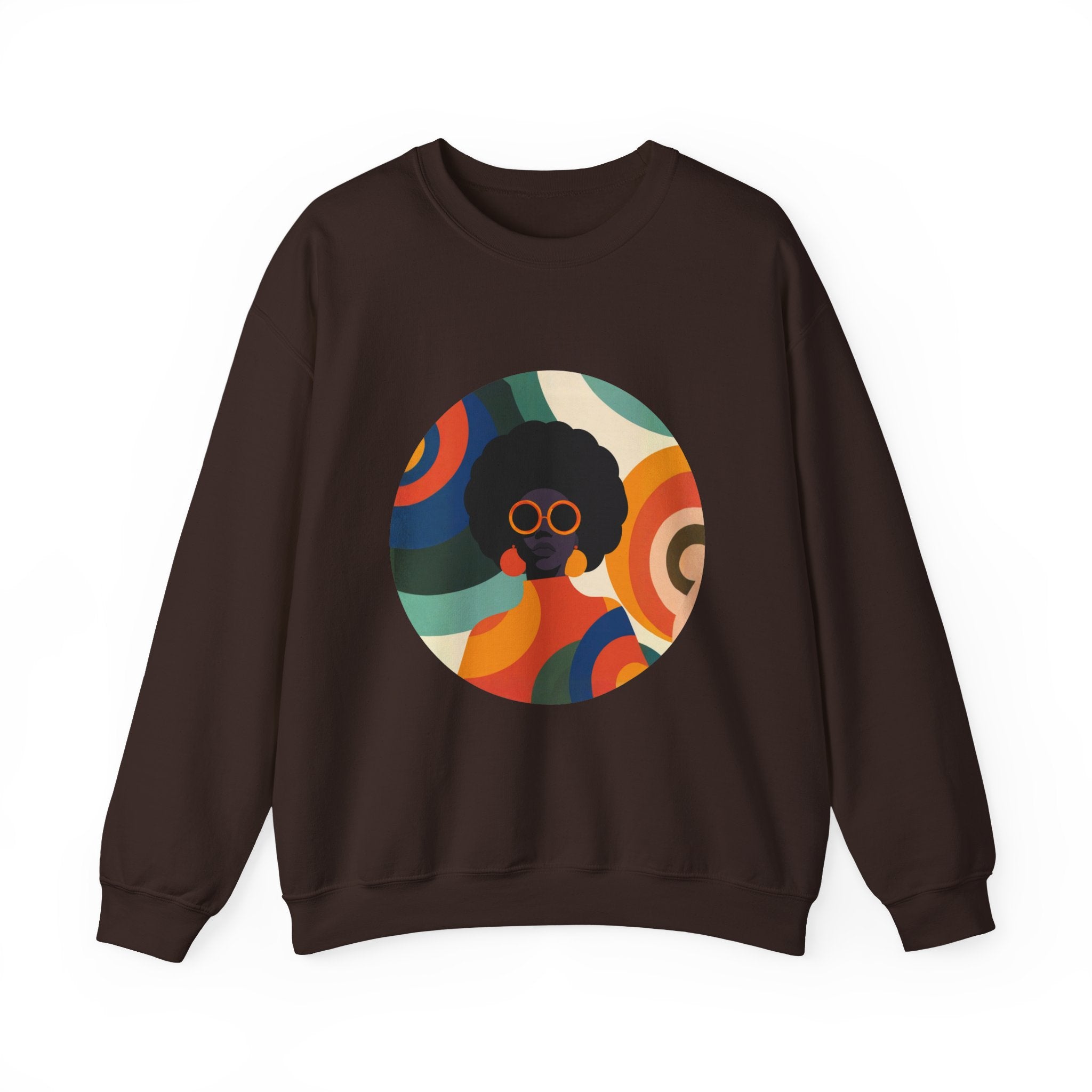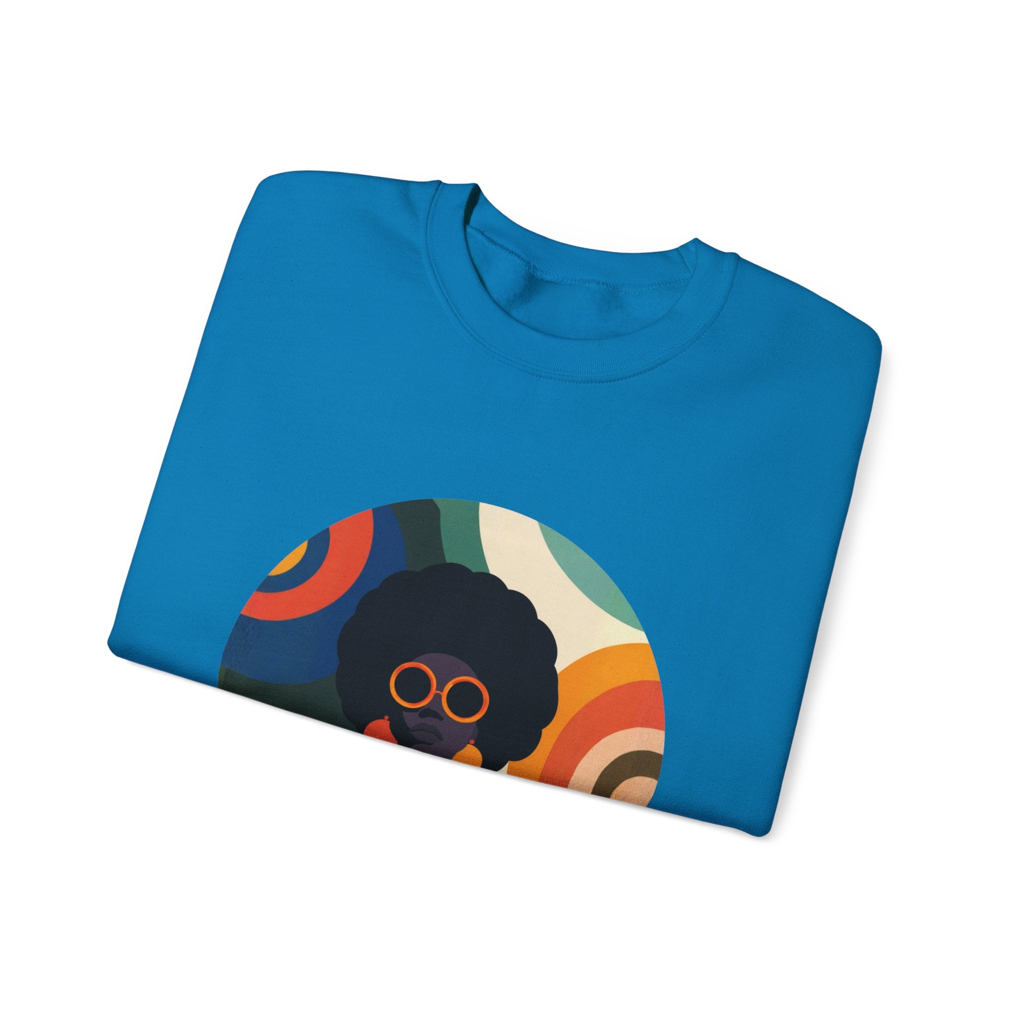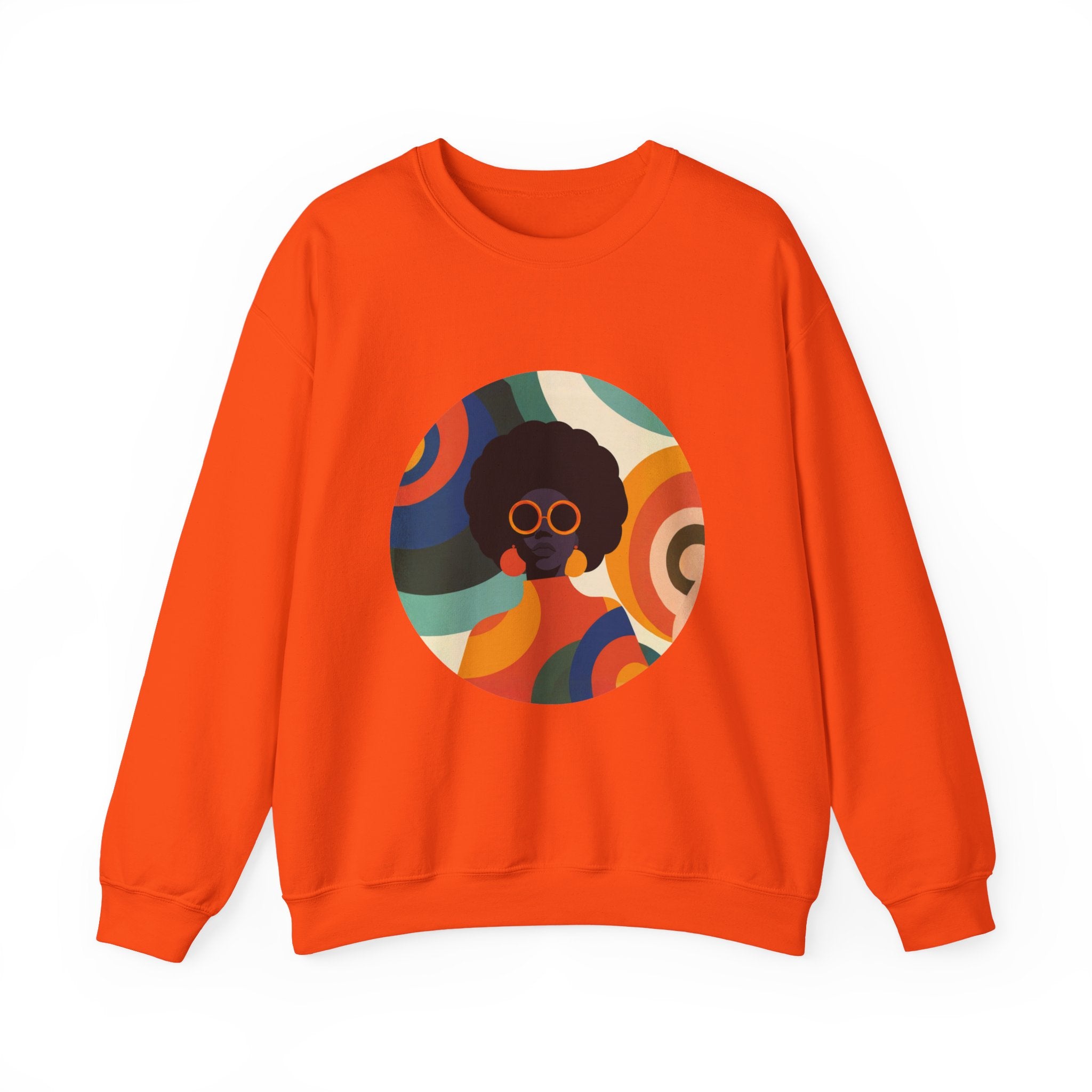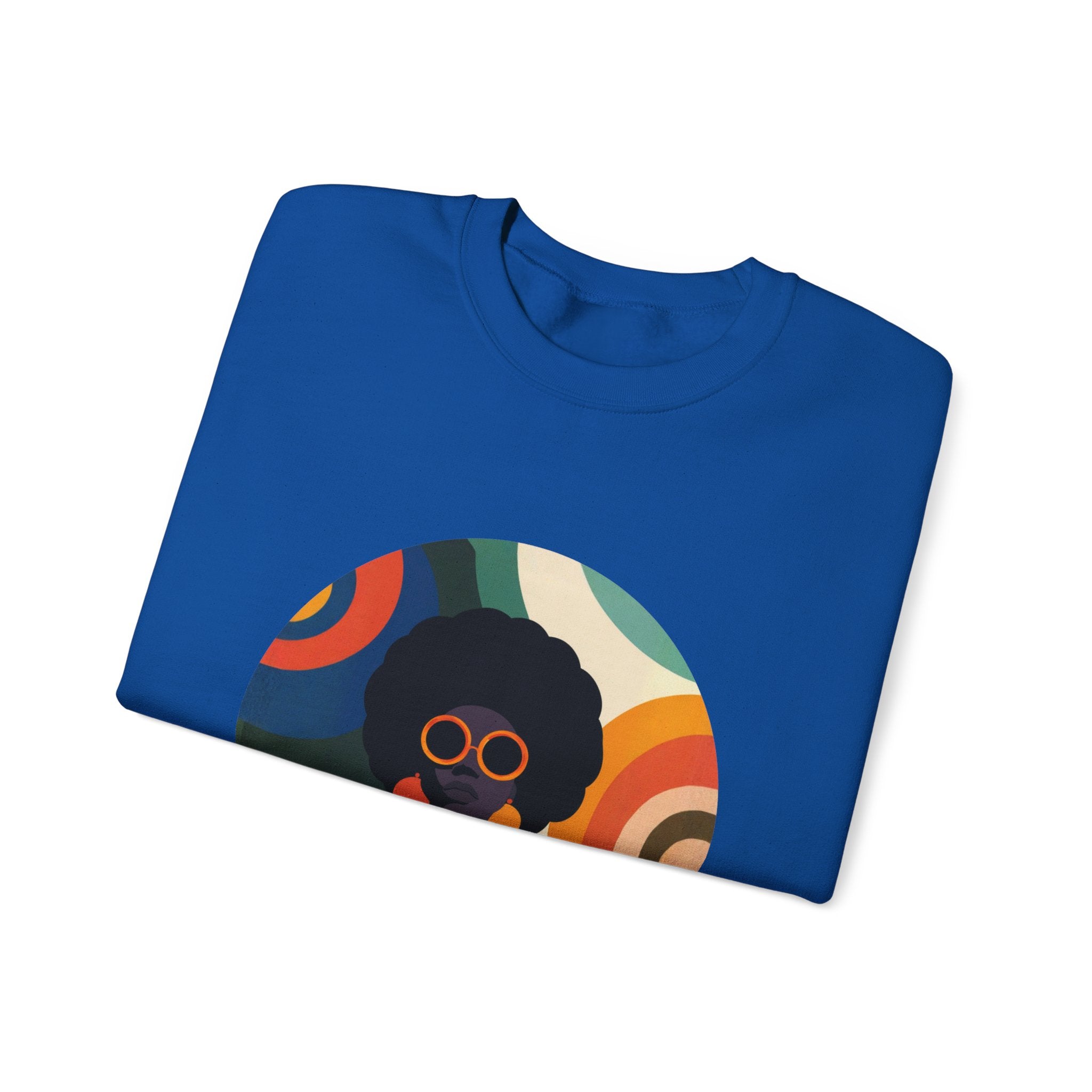This cozy crewneck brings vintage soul and modern comfort together. A soft, medium-heavy cotton-poly blend holds a bold, retro circular graphic—warm oranges, teals and earthy neutrals swirl around a stylized silhouette with round glasses—so the design reads like a small, confident statement rather than loud branding. The classic fit and ribbed collar keep the shape neat while double-needle stitching ensures this sweatshirt stands up to frequent wear. Lightweight enough for layered fall walks, yet substantial for chilly evenings at home or low-key gallery nights. Ethically sourced cotton and OEKO-TEX certified dyes mean it looks good and feels responsible.