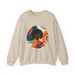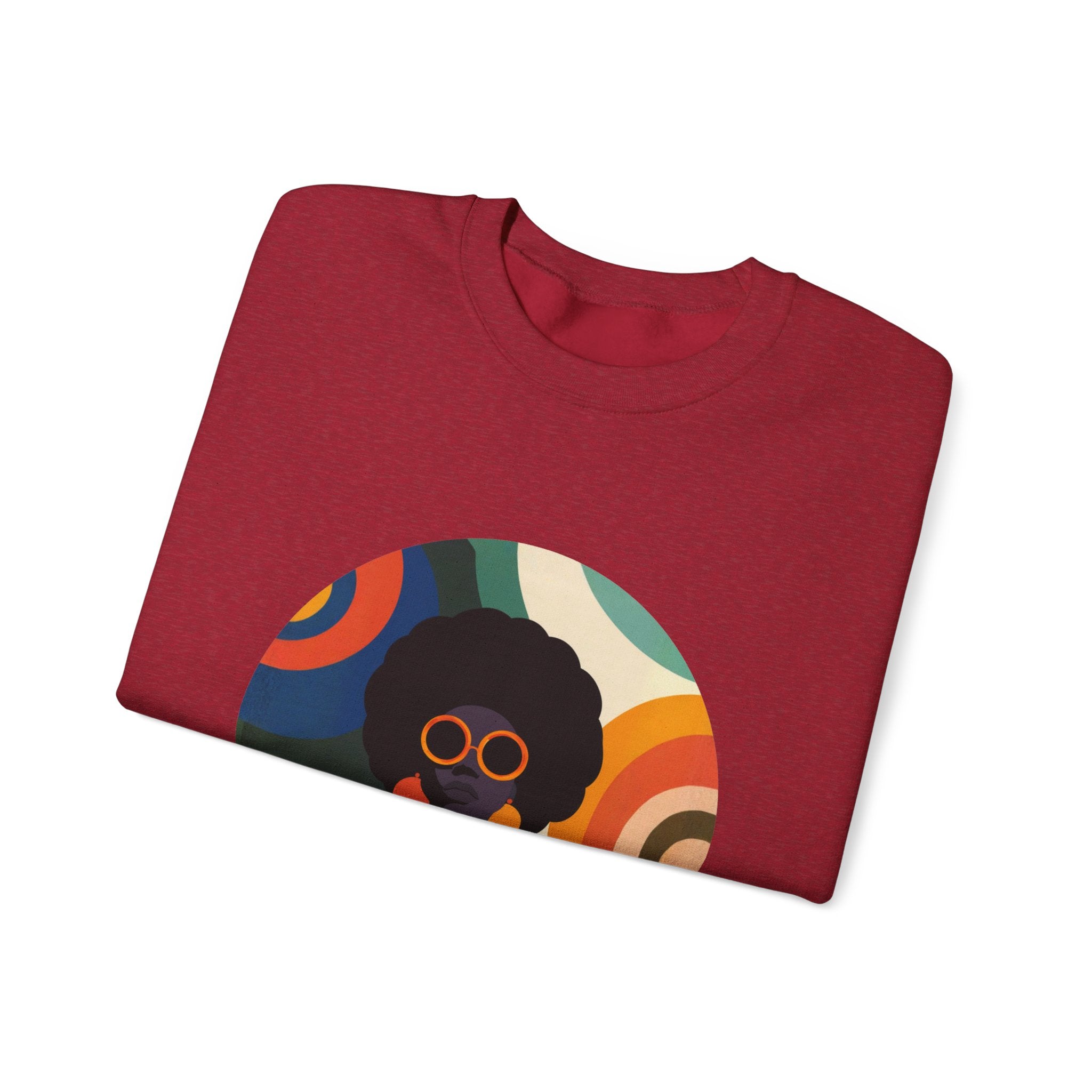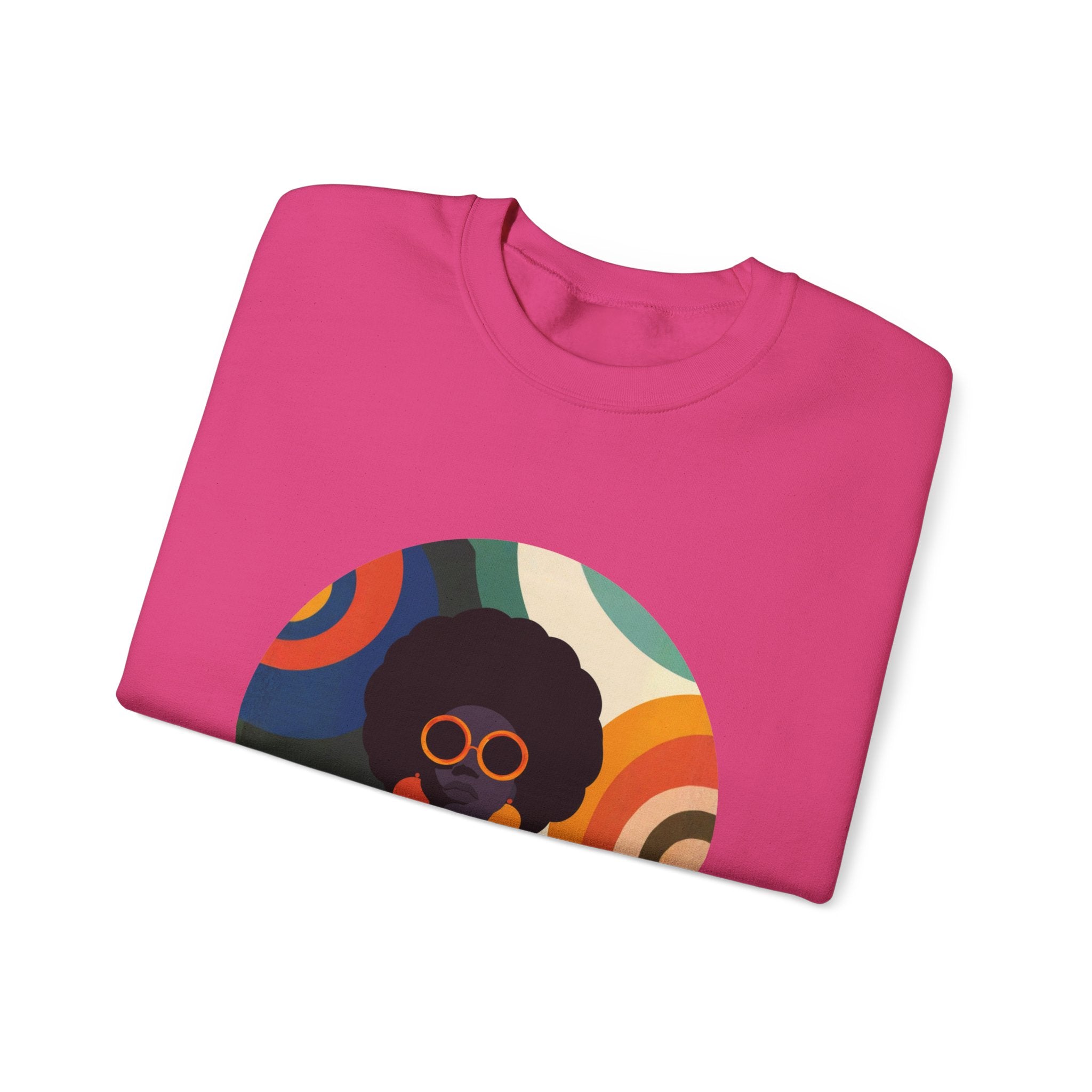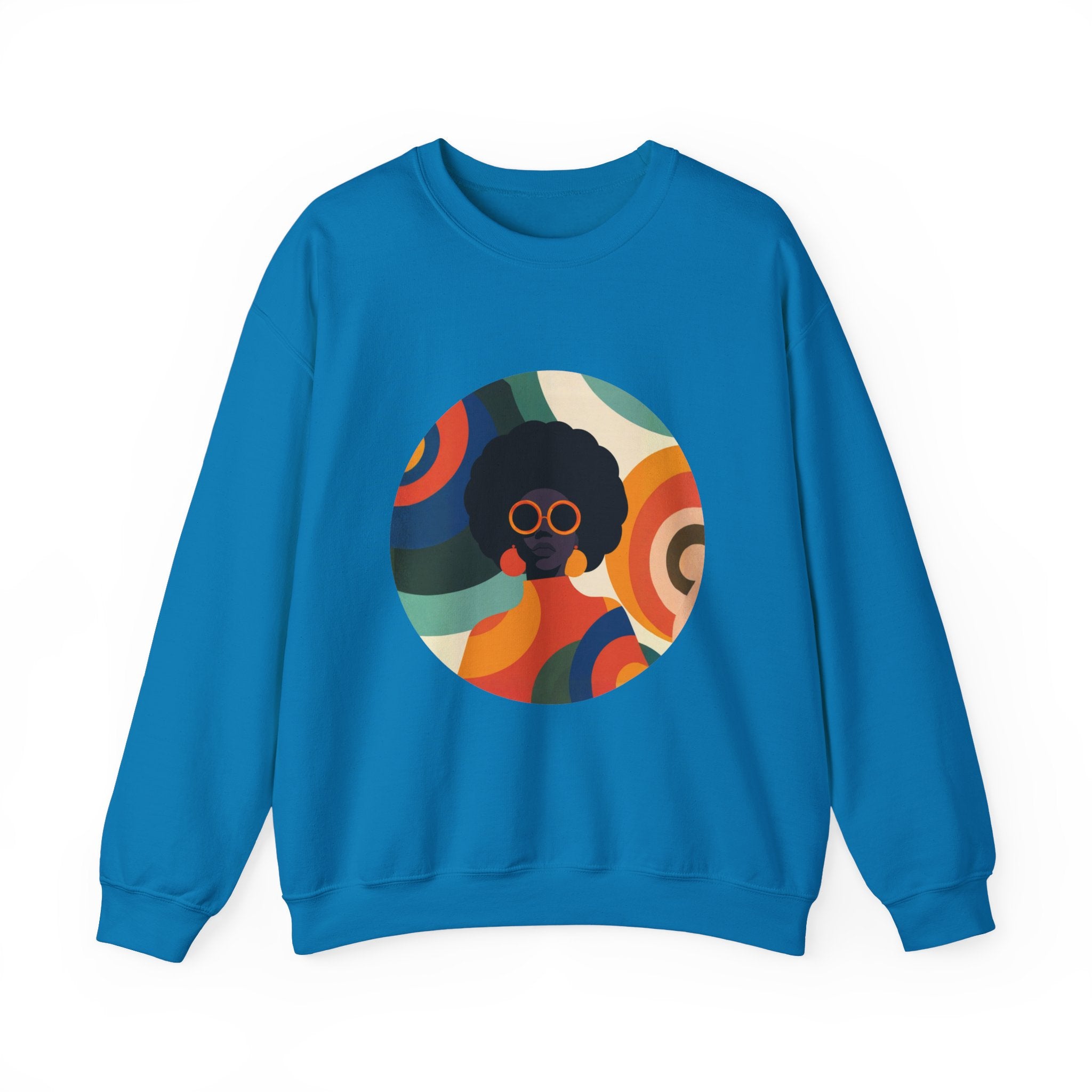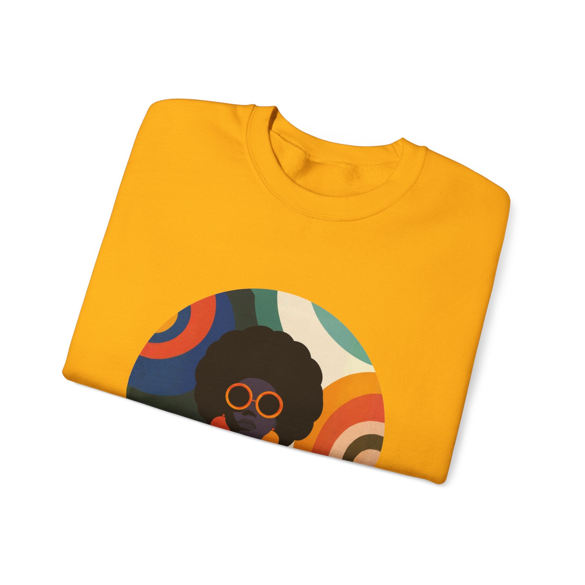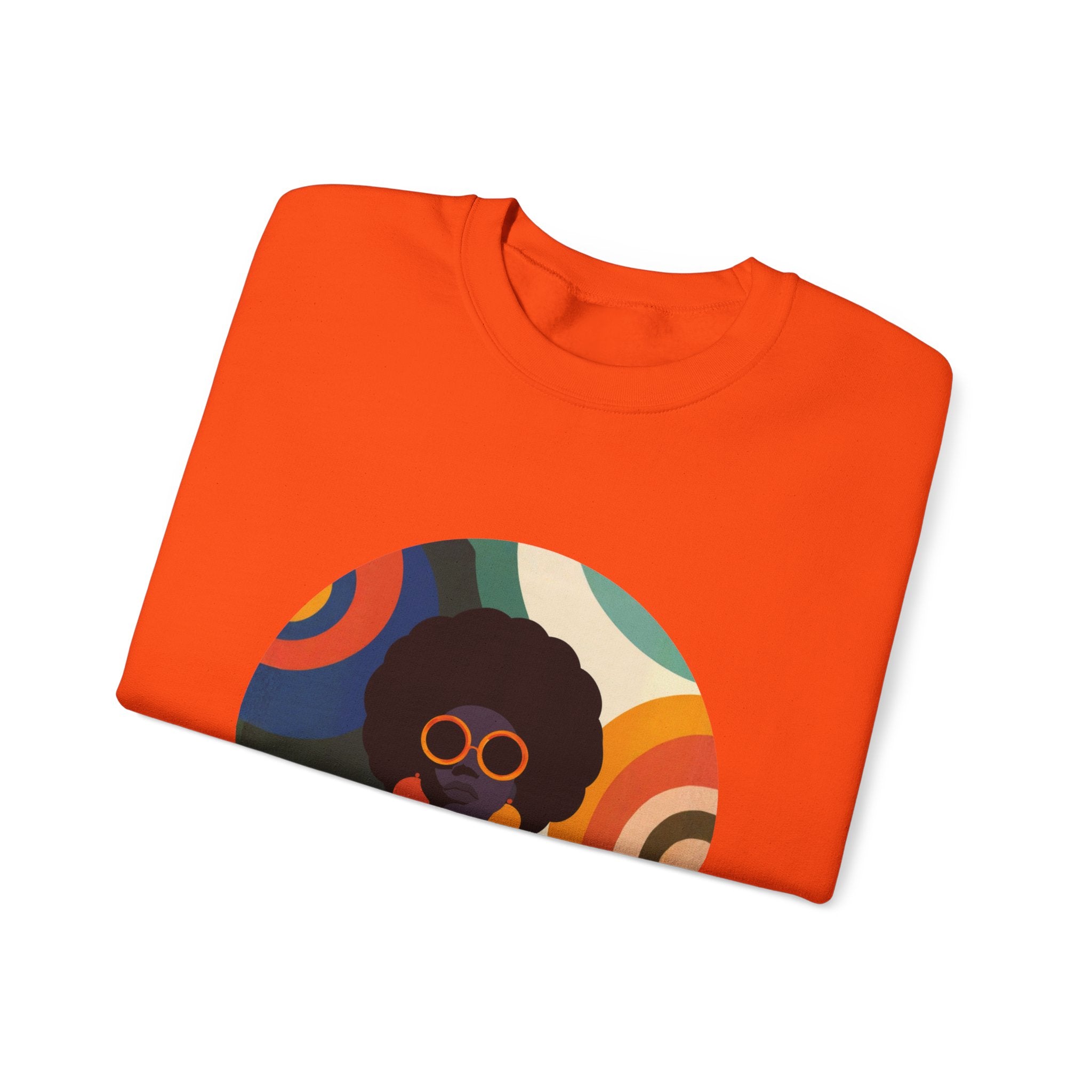 This cozy crewneck brings vintage soul and modern comfort together. A soft, medium-heavy cotton-poly blend holds a bold, retro circular graphic—warm oranges, teals and earthy neutrals swirl around a stylized silhouette with round glasses—so the design reads like a small, confident statement rather than loud branding. The classic fit and ribbed collar keep the shape neat while double-needle stitching ensures this sweatshirt stands up to frequent wear. Lightweight enough for layered fall walks, yet substantial for chilly evenings at home or low-key gallery nights. Ethically sourced cotton and OEKO-TEX certified dyes mean it looks good and feels responsible.